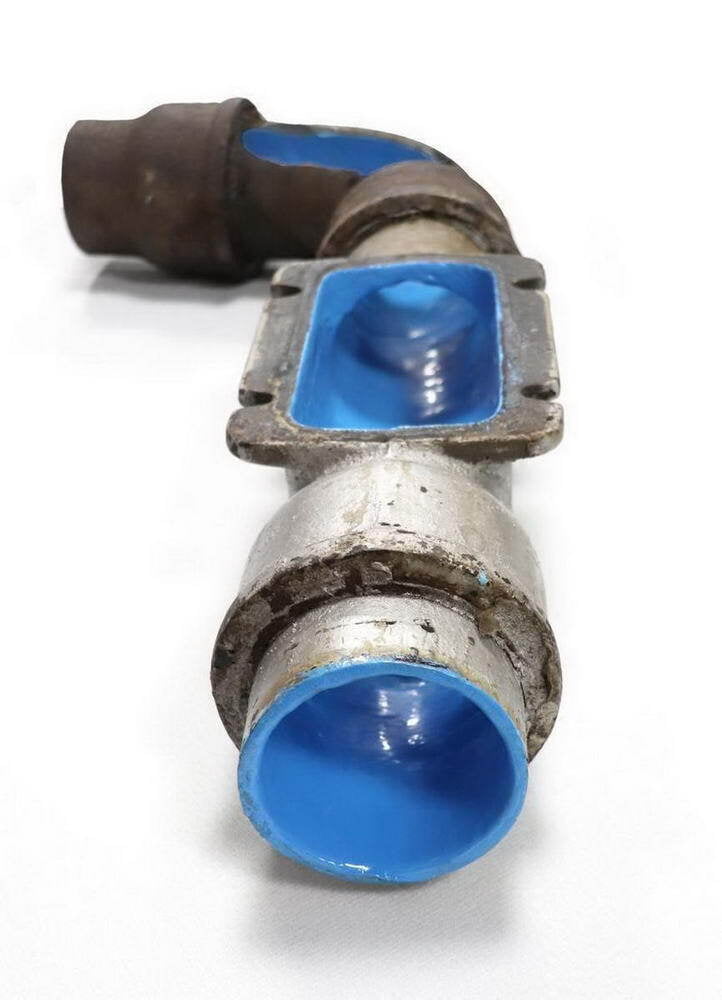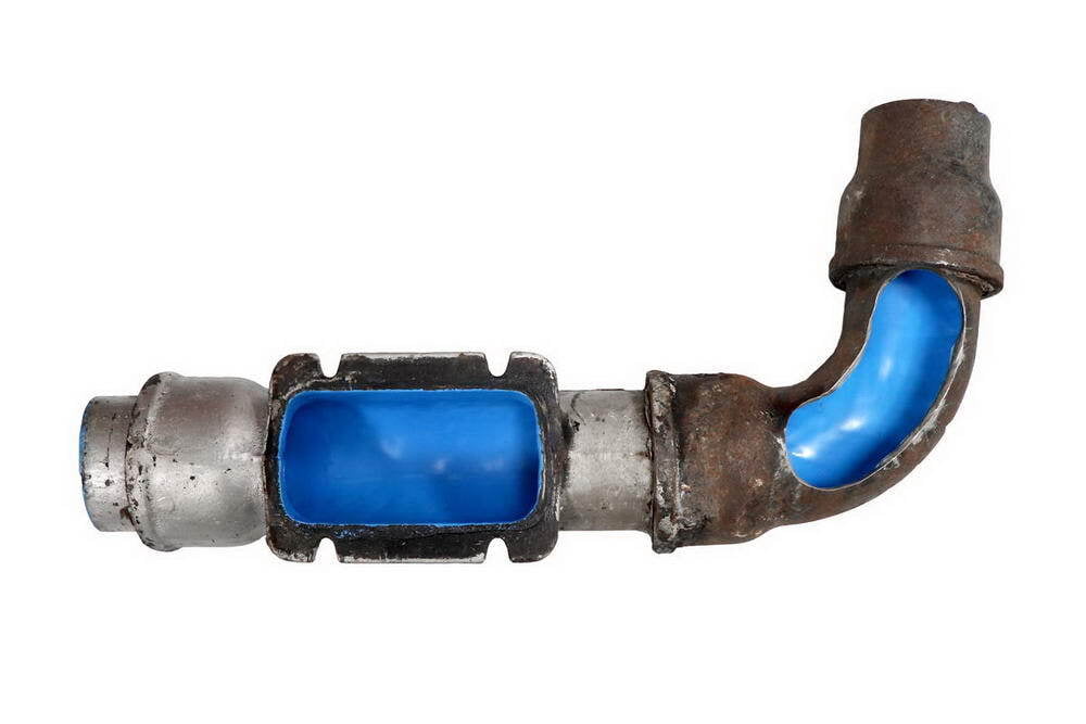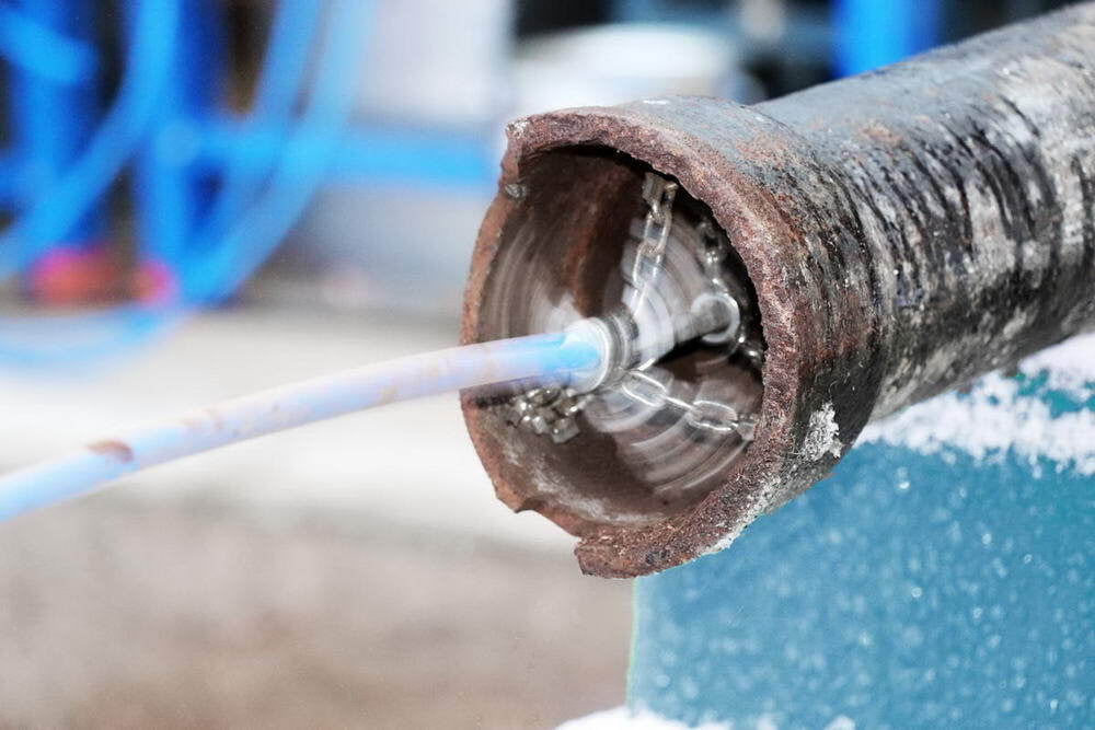 ....Ein für die jeweilige Nennweite dimensionierter rotierender Bürstenkopf, verteilt das durch einen Schlauch in die Leitung hineingepresste Harz sauber im Rohr. Primär wird der Bürstenkopf für die ersten Beschichtungsvorgänge verwendet. Alternativ bzw. ergänzend erfolgen Beschichtungsvorgänge über eine rotierende Düse, die in einer Führungseinheit stets zentriert im Rohr positioniert ist. Beide Varianten werden manuell in die Leitungen eingeschoben und der Beschichtungsvorgang erfolgt jeweils beim Zurückziehen. Die Rotationsgeschwindigkeiten des Bürstenkopfes, als auch der Düse, sind dabei variabel einstellbar, ebenso wie der Druck, mit dem das Harz auf die Rohrwandung aufgebracht wird. ..A rotating brush head, dimensioned for the respective nominal size, neatly distributes the resin pressed into the pipe through a hose. The brush head is primarily used for the first coating processes. As an alternative or in addition, coating processes take place via a rotating nozzle that is always positioned centered in the pipe in a guide unit. Both variants are manually pushed into the lines and the coating process takes place when they are withdrawn. The speed of rotation of the brush head and the nozzle can be set variably, as can the pressure with which the resin is applied to the pipe wall. ....