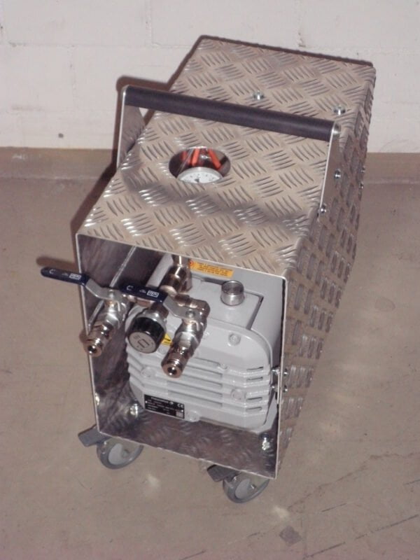 Mobile und kompakte Vakuumpumpe für das Evakuieren von Luft in Schlauchlinern.